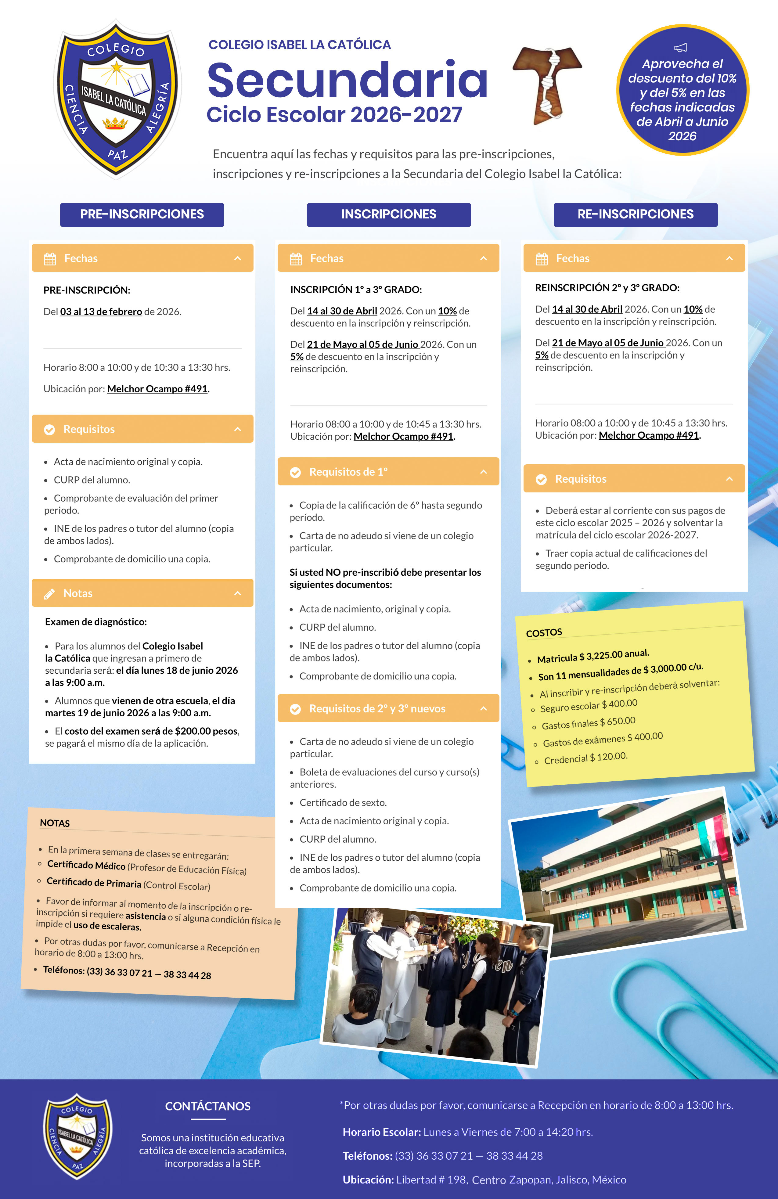 Encuentra aquí las fechas, costos y requisitos para las pre-inscripciones, inscripciones y re-inscripciones a la Secundaria del Colegio Isabel la Católica: