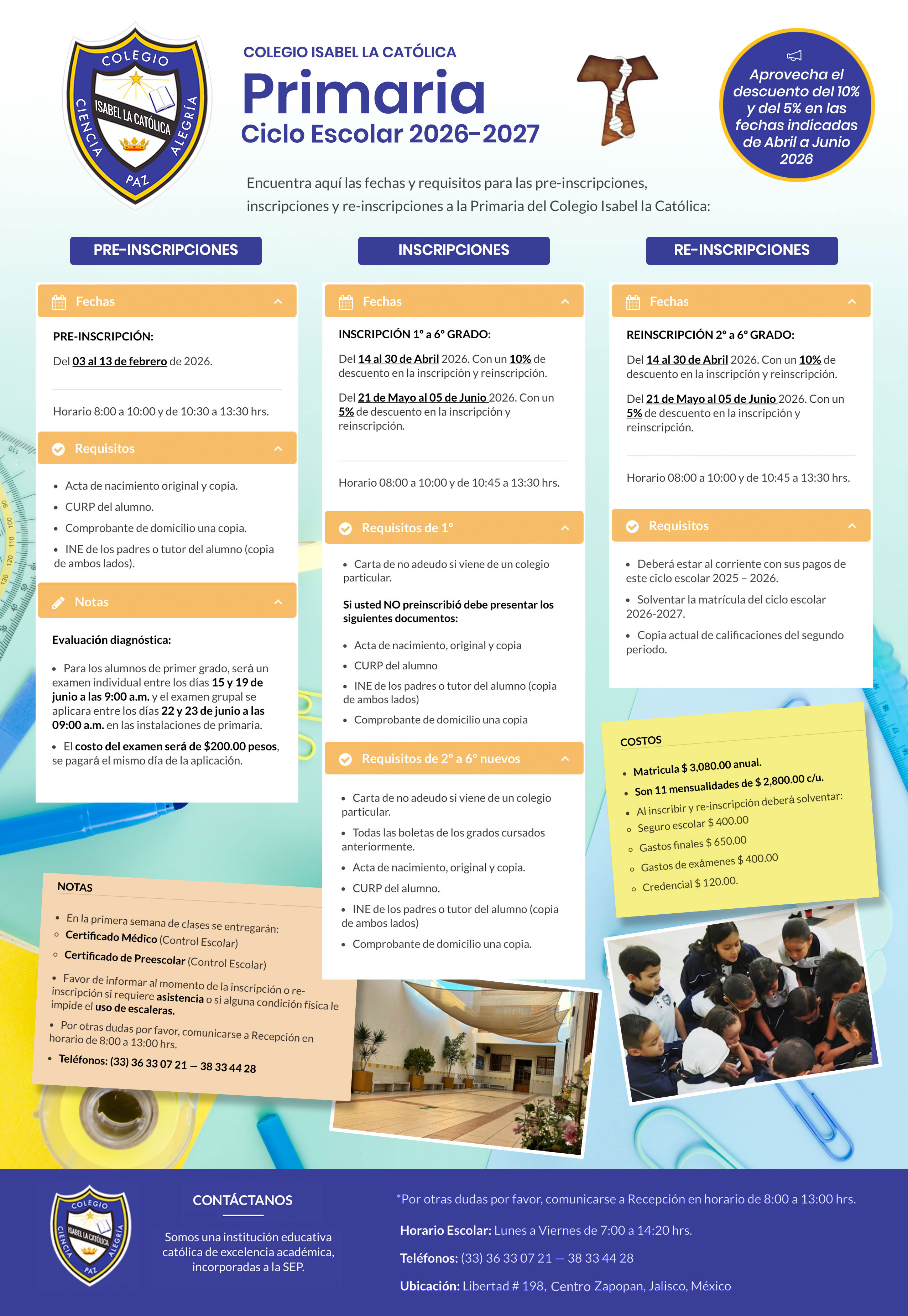 Encuentra aquí las fechas, costos y requisitos para las pre-inscripciones, inscripciones y re-inscripciones a la Primaria del Colegio Isabel la Católica: